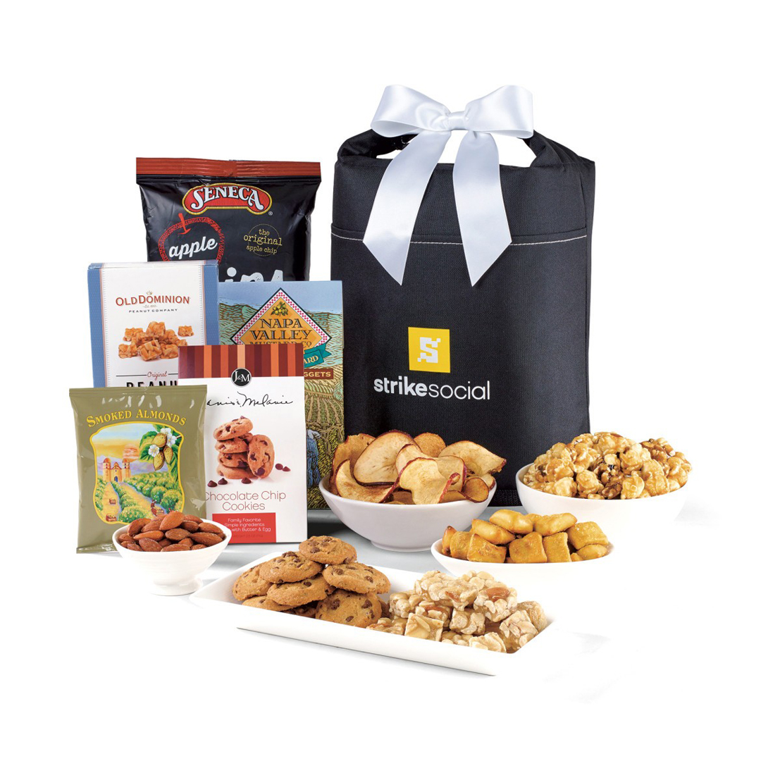 Packed with gourmet snacks, this cooler is the gift that keeps on giving, featuring a sweet and savory assortment of favorites like chocolate chip cookies, peanut crunch, apple cinnamon chips, smoked almonds, sourdough honey mustard pretzel nuggets and caramel popcorn.